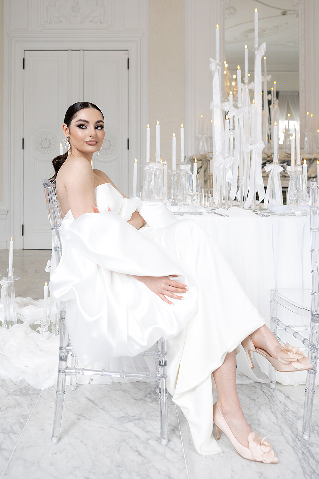 Włoskie atłasowe cholewki, które podkreślają klasę i ponadczasową elegancję każdej pary. Kolekcja biżuterii do butów wykonywana jest z jedwabiu Armani i tkaniny Pronovias.