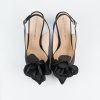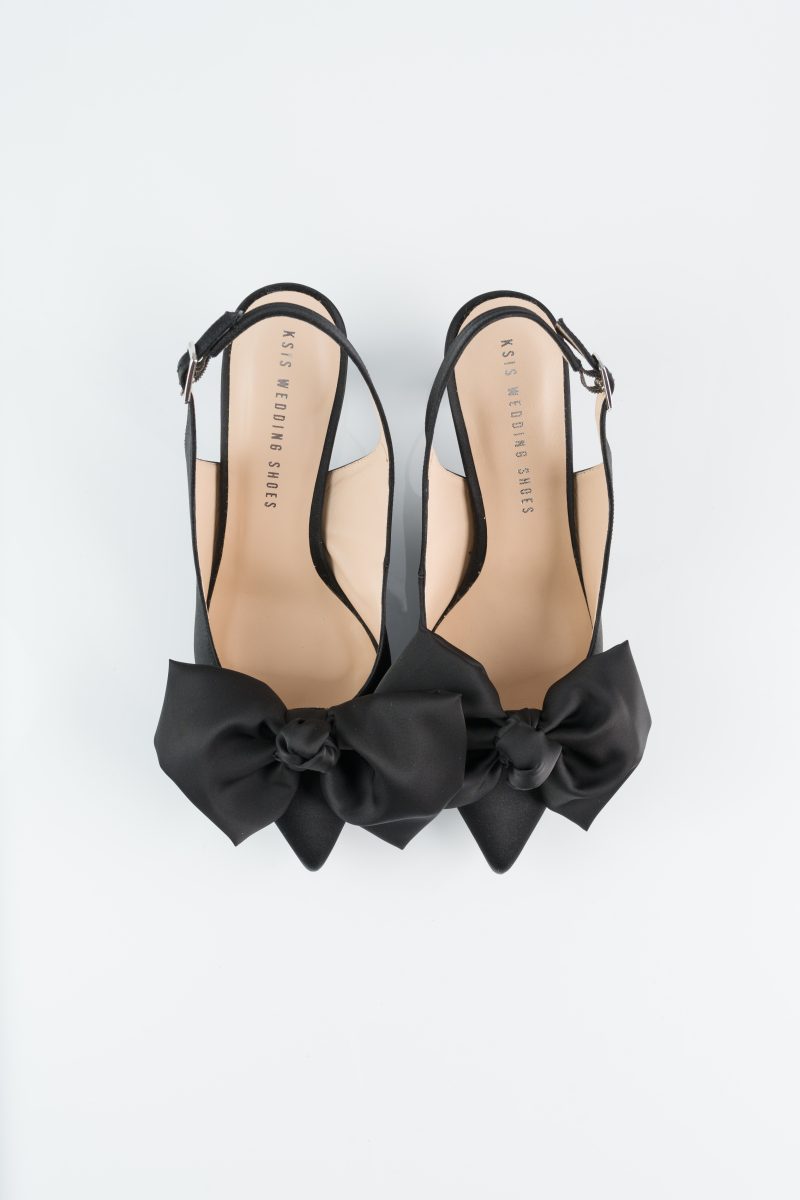 Evening pumps made of satin in deep black. Featuring a soft leather lining inside. The gently pointed nose, stylish cut-outs on the side and the slender stiletto heel add lightness and elegant chic to this model. Leather lining in a neutral shade and “memory” insoles ensure maximum comfort and fit of the shoe to the foot. Stilettos with an open heel can be worn with a formal dress, a cocktail skirt or a casual, ladylike suit. The classic cut is a striking addition to any outfit. Remember to attach a brooch to the sleek styles – clip here satin bows from Armani satin and you will totally change the look of your shoes.